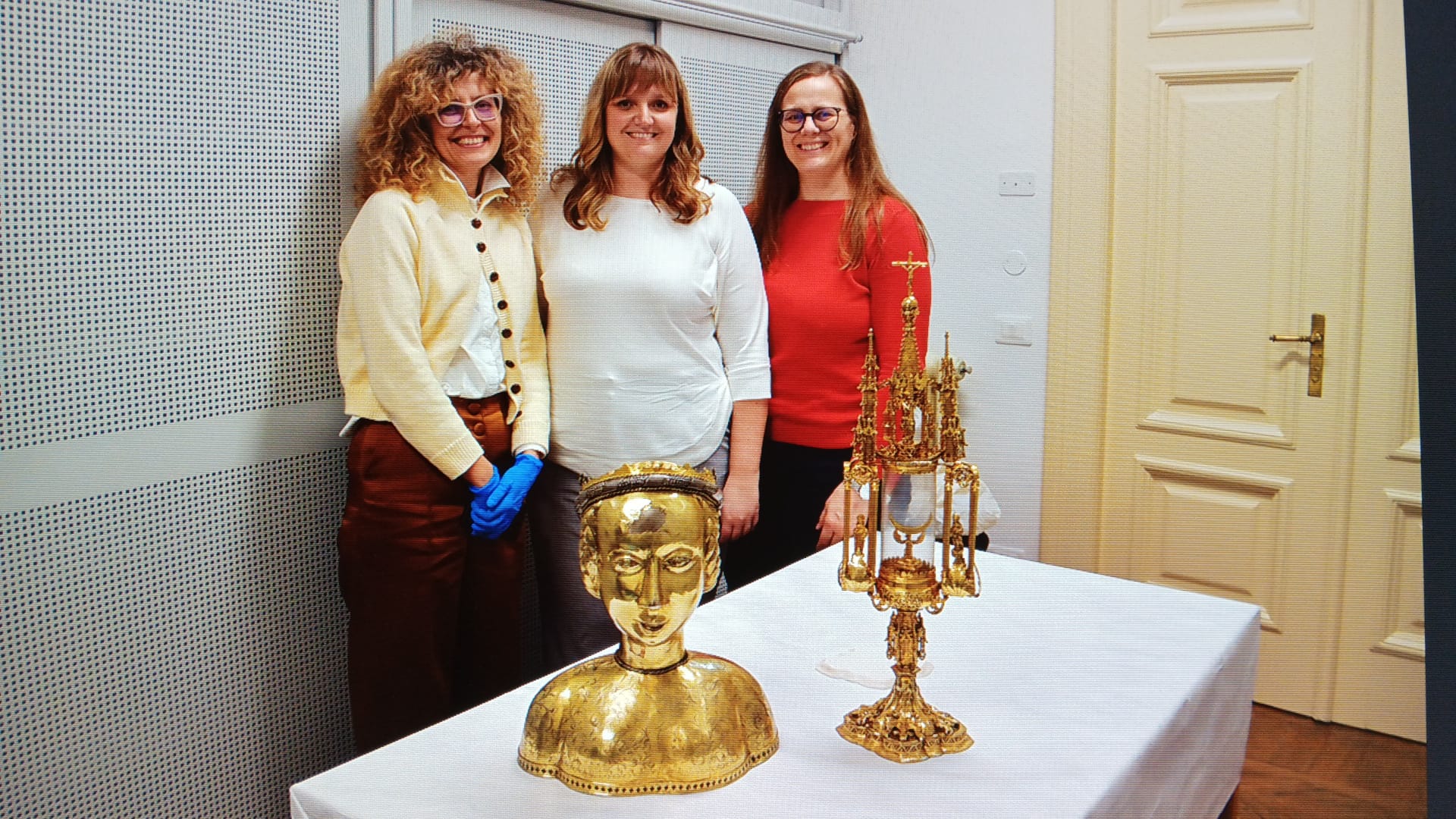 Dr. sc. Petra Predoević Zadković, nasl. docent, izv. prof. dr. sc. Barbara Španjol -Pandelo i izv. prof. dr. sc. Saša Potočnjak, članice istraživačke grupe projekta HADRIA – Hagiographia Adriatica: materijalna recepcija i društvene prakse Sveučilišta u Rijeci (uniri-iz-25-273), koji financira Europska unija – NextGenerationEU tijekom pregleda vrijednih umjetnina pri Soprintendenza archeologia, belle arti e paesaggio del Friuli Venezia Giulia, a iz crkve UBDM u Rijeci relikvijara sv. Ursule (15. st.) i pokaznice Barbare Frankapan (1489.).